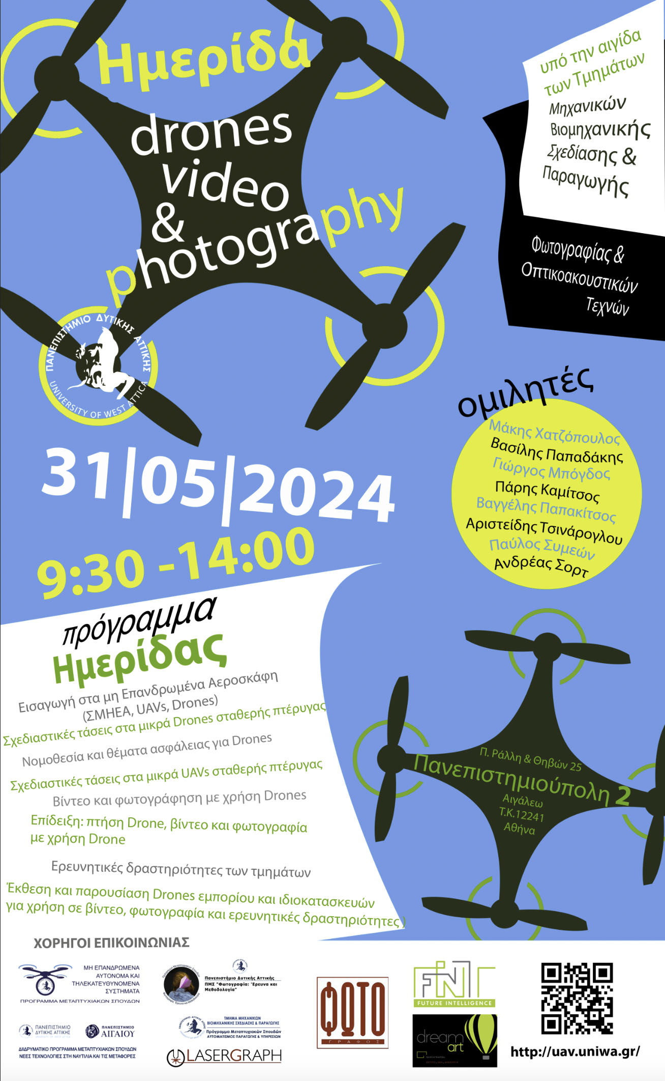 Το Πανεπιστήμιο Δυτικής Αττικής χαιρετίζει τη διοργάνωση αυτής της σημαντικής εκδήλωσης και προσκαλεί τους φοιτητές, τους επαγγελματίες και τους ενδιαφερόμενους να συμμετάσχουν και να εξερευνήσουν το συναρπαστικό κόσμο των drones, της φωτογραφίας και της κινηματογράφησης.